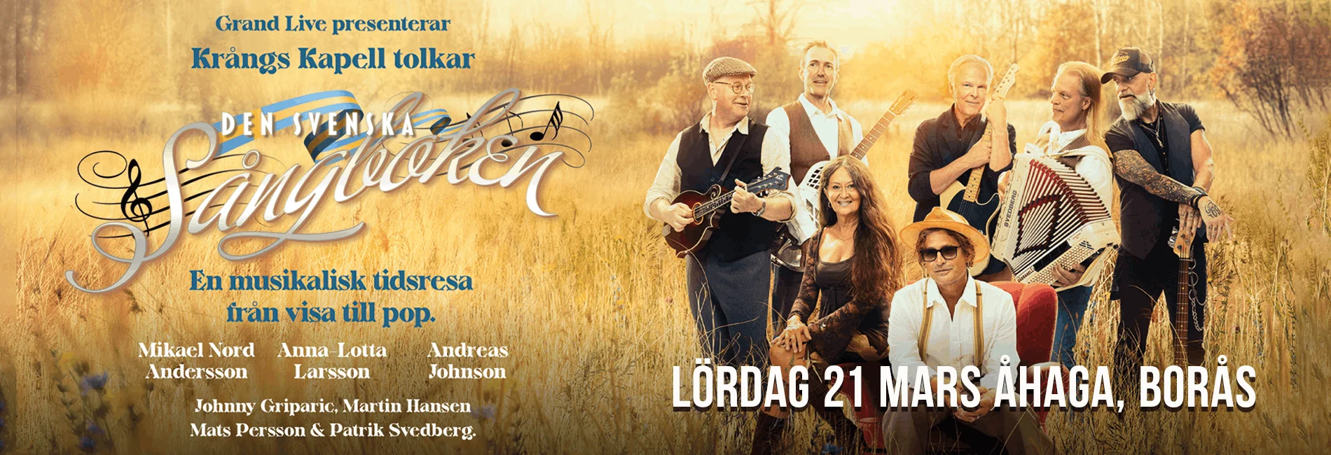 De har bland annat arrangerat Scorpions världsberömda MTV Unplugged-show i Aten, skapat musik till soundtracket för Spiderman II och producerat Björn Skifs odödliga klassiker ”Håll Mitt Hjärta”. Producentduon Mikael Nord Andersson och Martin Hansen har under många år satt avtryck på både den svenska och internationella musikscenen. Nu är de tillbaka – denna gång som producenter för Den Svenska Sångboken. Men duon nöjer sig inte där. I samband med turnén presenterar de även sitt nya band, Krångs Kapell, bestående av några av landets mest meriterade musiker. Tillsammans med artisterna Anna-Lotta Larsson och Andreas Johnson bjuder de publiken på en oförglömlig musikalisk resa genom den svenska musikhistorien.